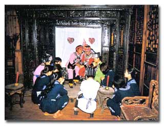 二、订婚 土家族人订婚,俗叫“认亲”,又叫“放爆竹”。女方的父母许亲后,就商量“认亲”的事。“认亲”有大小之分。 (一)小“认亲”(小放爆竹)。由媒人带领男孩和备办的酒、肉、粑粑、团馓等礼物去女方谢恩。男孩到女方家里,先放爆竹,拜祖先、拜亲爷亲娘,并要媒人指引男孩向伯伯、伯娘、叔叔、婶娘……逐个请安,这才叫“正式订婚”,告诉邻居亲事己定,别人不要再打主意。有些地方,女方把女儿的生庚时辰用红纸写下来交给男方,也叫“取八字”。男方合上“八字”后,才放爆竹认亲。小“认亲”,一般不留客,当天去,当天回。 (二)大“认亲”(放大爆竹),男方父母同媒入选择吉日,带上男儿和酒、肉、衣服、糯米粑粑、团馓、鞭炮等礼物,到女家后,先放爆竹,祭祖先,男儿给亲爷、亲娘磕头礼拜。然后去女家的伯伯、叔叔家里去送礼、放爆竹、磕头请安。此次,新亲家相会,格外亲热。当天,女方要办酒席宴请本家的亲族戚友,这叫请“认亲酒”,即“订婚酒”。女方叫女儿以敬茶为由,给婆家父母下拜请安,给长辈敬茶,名叫“见面礼",吃茶人必须回赠茶礼(亦叫见面礼)。新亲家相会,必须留客住宿。次日早晨,女方仍叫女儿给昨天敬茶的长辈,恭恭敬敬地各舀一盆洗脸水,洗脸人也要回赠礼物。 女家散客后,将男家送来的粑粑,按亲族每户送两个,叫“耳朵粑粑”。俗话说:“田是私田,女是众女。”意谓亲族都要承认这门婚事。 “大认亲”回来,女方要赠男方一些鞋子、花带子、绣花手巾及银钱等礼物。但男方盛酒去的坛子被留下,直到男女结婚生儿育女之后,将酒坛装上食油,由娘家“望月”时送去男方。意谓养女本是养的酒坛子,而今生男育女,酒坛子变成了油坛子。 一般在“大认亲”两天之后,男方要请女方的父母作“过门客”。俗叫“走亲家”。作“过门客”,要带礼品,回来时男方要打发回礼。 订婚之后,逢年过节,男方要向女方家拜年贺节。拜年时,要送猪腿、粑粑、团馓、糖食、酒等礼物;女方则做一至二双布鞋,或打发钱物作回礼,以发展和巩固亲姻关系。 三、结婚 (一)求婚。男方要求结婚时,婚前那年农历正月初,选择吉日要到女方家拜年。拜年时的礼物中要送一只连猪尾巴的猪腿。女方若同意该年结婚,就收下连尾巴的猪腿,若不同意,则将猪尾巴割下退回男方,表示推迟婚期。男方给女方拜年时,礼品中绝对不能送猪头,因猪头是送给媒人的,意味着这门亲事是媒人开的头。要是把猪头做礼物送给女方,意味着这门亲事是女方倒说媒,是对女家的侮辱。达成结婚协议之后,娘家准备嫁妆,婆家准备衣服等物,双方筹办儿女喜事。 (二)送日子。女方同意这年出嫁后,男方就择定结婿吉日,并取得女家同意之后,男方则请媒人带上酒肉和衣服等礼物,到女方家“送日子”,正式决定婚期。若女方不同意,男方则要另择日子,再定佳期。 (三)忙嫁。婚期确定后,男方要作好接亲的准备,备好过礼的酒肉、礼布和送给新娘的衣服、首饰等,而女方则要准备“嫁奁”。女儿出嫁时,无论贫富都要准备一、二床“西兰卡普”(土家织锦)被盖,其他嫁妆量力而为,一般都要陪柜子、箱子等用具和四、五床被盖。经济条件较好的要陪柜、桌、椅、箱等全套家具和十二床被盖,这叫“单陪单嫁”。富裕人家要陪二十四床以上被盖和双套家具,谓之“双陪双嫁”。姑、舅、伯、叔、姨等近亲也要送一床被盖等陪嫁礼品,尽力相助。新娘的衣物多寡,由女方决定,如女方缝几件裤子,要求男方送几件衣服配套;女方备几床棉絮和被面,要求男女送几床被里子。另外,女方还要做若干双送给婆家长辈的布鞋,以及闹新房时送给青年人的花带子、花手帕……,使女方忙得不可开交。因此,土家族之女子,在出嫁之年一般不从事田间劳动,全力忙嫁。 (四)过礼。婚前三天,男方请人到女方家送礼,俗叫“过礼”。男方为女方送去准备嫁女用的酒、肉、衣服、首饰、被里子等礼物。同时,还问清楚,迎亲那天要多少人,几乘轿子,还有什么未尽事宜,女方完全答复后,就准备迎亲。 (五)哭嫁。婚前一月或半月,新姑娘按习俗规矩每夜晚要哭嫁,出嫁前夕要连续哭三至七个夜晚。新娘哭嫁时,全村寨相好的姐妹都要来陪哭、对哭。哭嫁的内容十分丰富,有“哭父母”、“哭戴花”、“哭吃离娘饭”、“哭离闺门”、“哭上轿”等等。到出嫁时新娘哭得眼皮红肿,声音嘶哑;哭得越狠,人说这姑娘有出息;哭得越好,人说那姑娘有才华。哭嫁期间,嫡亲叔伯,请侄女做客吃饭,叫吃“送嫁饭”(女方哭嫁的歌词见第七章第一节:“哭嫁歌”)。 (六)戴花酒。结婚头天,为女方的“戴花”日,亲朋至友都来庆贺。吃“戴花酒”,给新娘戴花。 戴花前,请里手而贤德和有子女的妇女给新娘“开脸”,即扯去汗毛、修好眉毛,将长发辫子绾成“粑粑髻”。髻心缠红头绳,插上银簪、莲蓬、戴上青丝帕、牙签、手圈、耳环等头饰。开脸毕,举行戴花仪式。 仪式开始,新娘入中堂,鸣炮,奏乐、拜天地、祖先,而后,给新娘戴花。当司仪者喊到某某亲戚给新娘带花时,新娘予以哭谢。如喊到外公外婆戴花时,新娘便哭道:“我的阿公阿婆啊!孙女是个下贱人,头上戴花花不香,身披红绫也不红”。哭谢舅舅、舅娘时:“我的舅舅、舅娘呀!贱人戴花花不开,花插满头也不红。”哭谢姑母:“我的麻妈姑娘啊!花开花谢花又分,各到他乡成生人。”